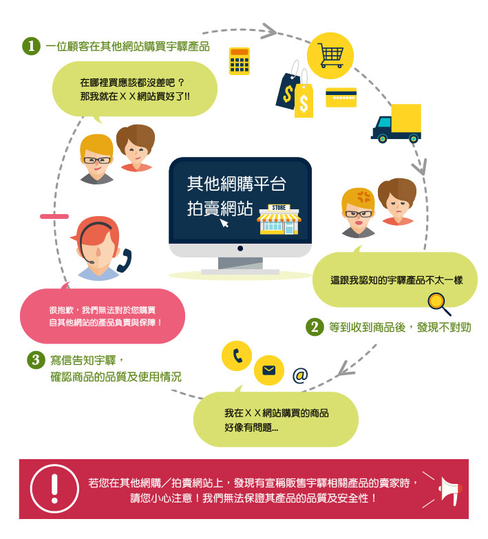 宇驛相關產品皆不在網路上販售,為保障消費者權益,確保經由醫院、診所及藥局的實體通路購買,才可以享有商品品質與安全的保障。